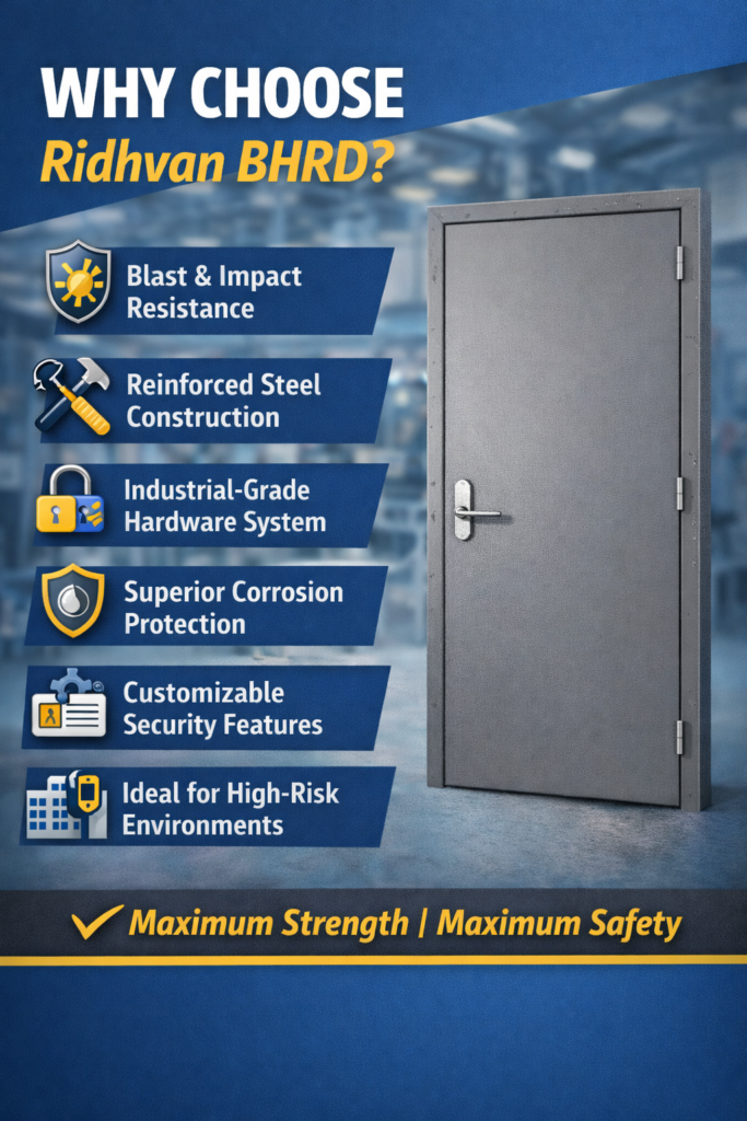 One of the key highlights of Ridhvan BHRD is its blast and impact-resistant capability. The door structure is engineered to absorb and resist shock waves and sudden pressure loads, helping protect both infrastructure and occupants. This makes it suitable for sensitive zones where additional safety reinforcement is required.