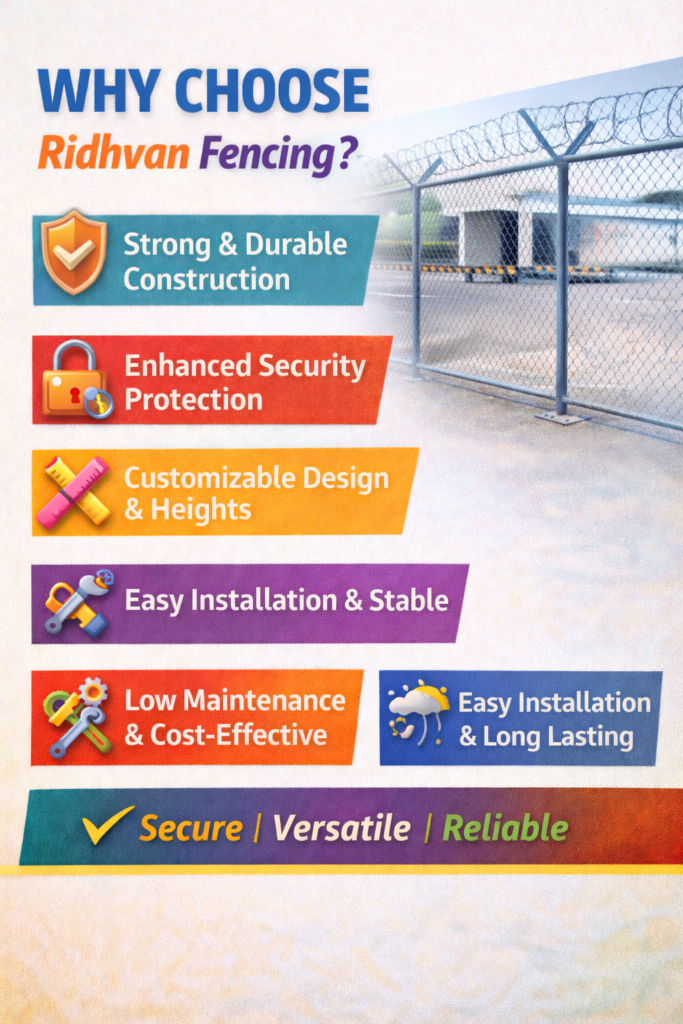 Ridhvan Fencing is a reliable and durable perimeter protection solution designed to provide safety, boundary control, and enhanced security for industrial, commercial, infrastructure, and residential projects. Engineered with high-quality materials and precision manufacturing, Ridhvan fencing systems offer long-term performance, strength, and visual appeal while requiring minimal maintenance.